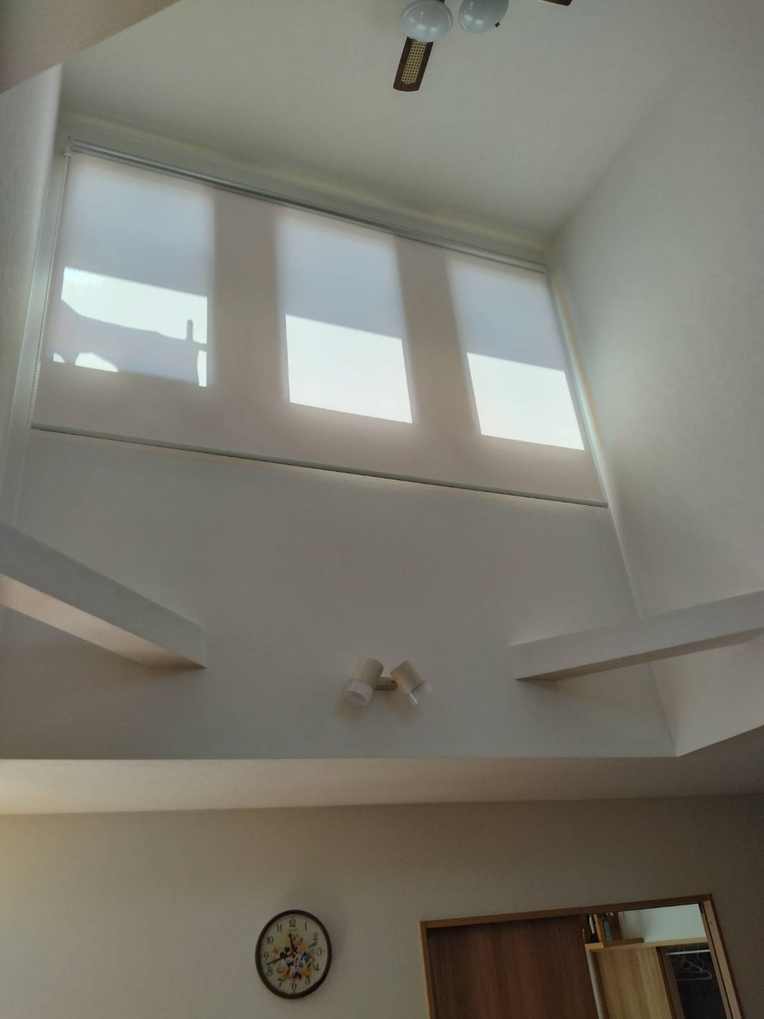 戸建て住宅にて目の前の隣地の新築住宅が建ち目隠しの為の吹き抜けにロールカーテンをご依頼でした。 仕方ないというか仕方ないですよね! たまたま目があってしまうのを考えれば・・・ オーダーにて本日設置完了です! 目隠しも、日よけも完璧ですね!