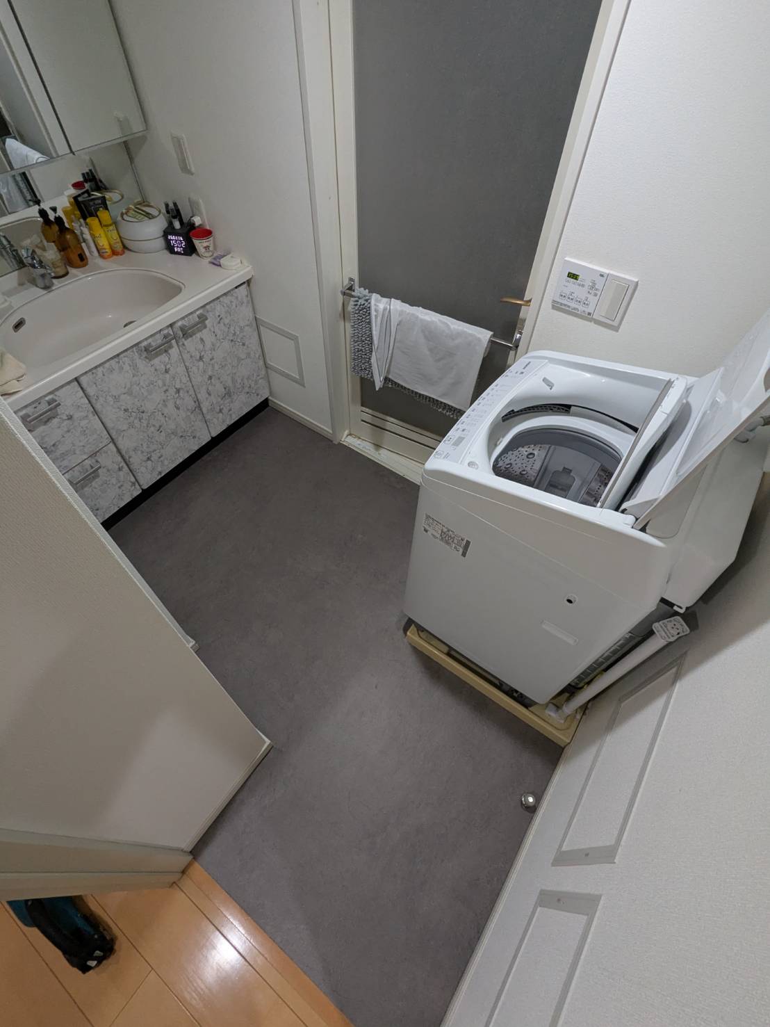 在宅中の工事 洗面場とトイレの床CF張替作業 何となく床もきれいになると気分も上がりますね!